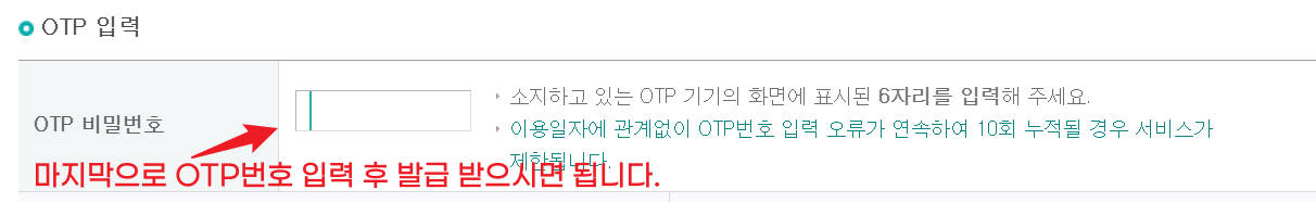 5. 마지막으로 OTP 인증번호를 넣고 발급을 받으시면 됩니다.