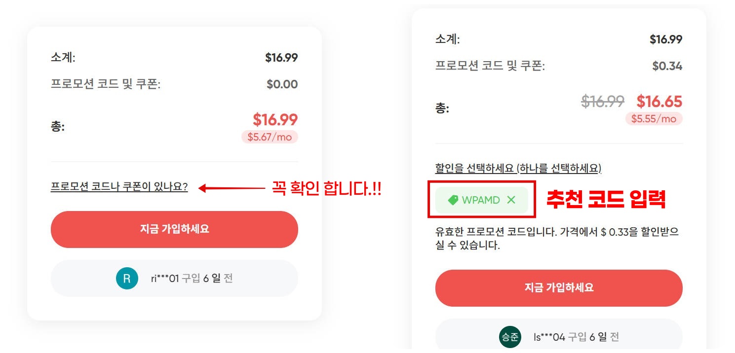▶ "프로모션 코드나 쿠폰이 있나요?" 클릭! 추천 코드를 입력하여 추가 할인을 받음.