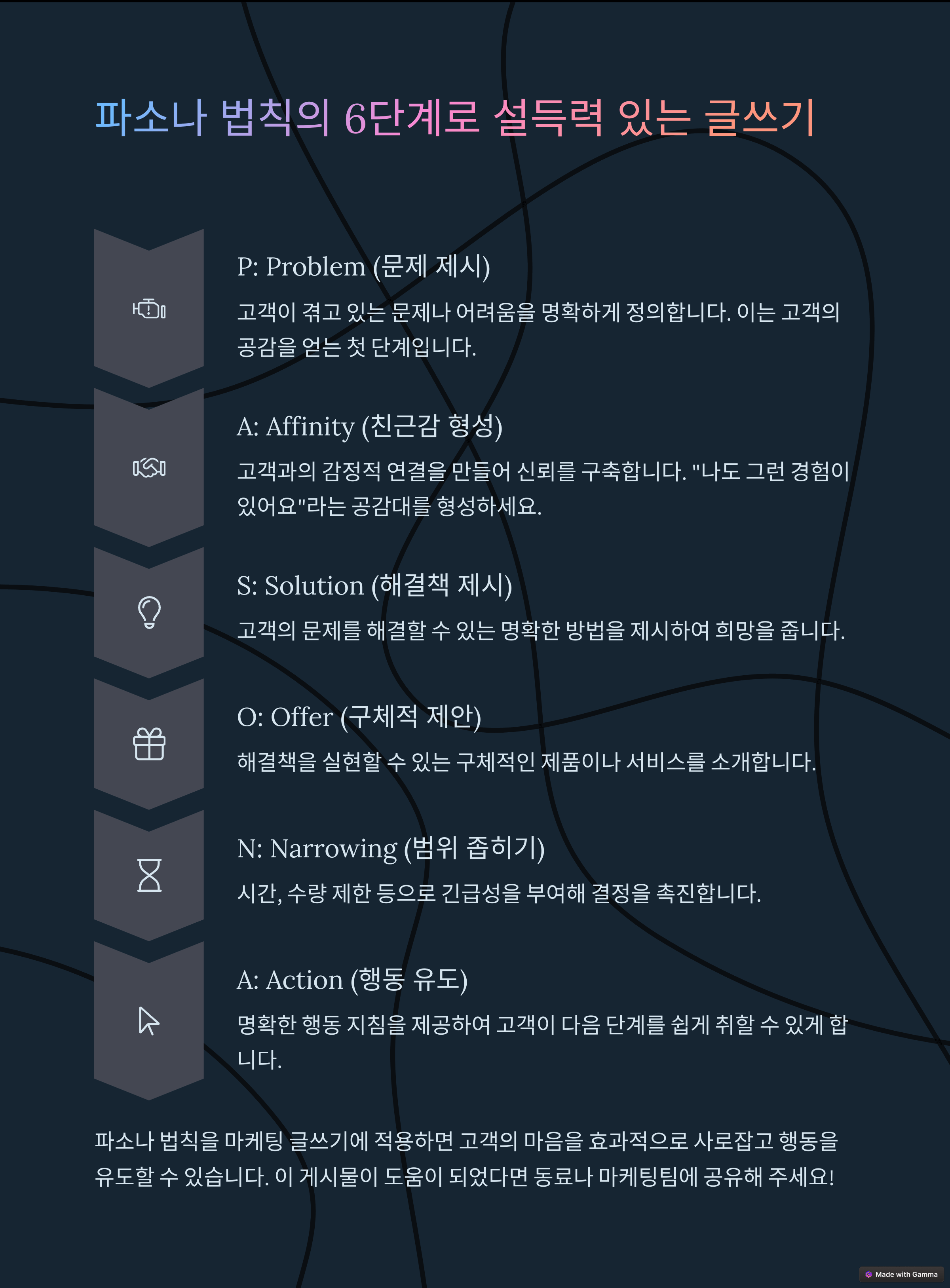 파소나 법칙은 단순히 정보를 전달하는 게 아니라, 독자의 심리적 여정을 설계하는 방식이기 때문이에요. 감정의 흐름을 따라 자연스럽게 설득당하게 되는 구조죠.