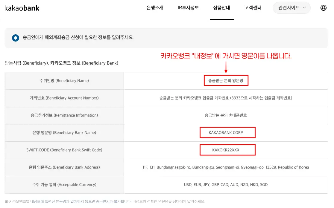 - 내정보 확인 : 카카오뱅크에 로그인 후 "내정보"로 가셔서 영문이름을 메모해두세요